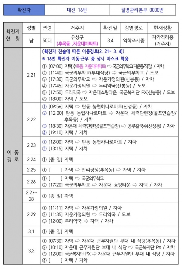 대전 지역 16번째 확진자의 이동 동선이 공개됐다.