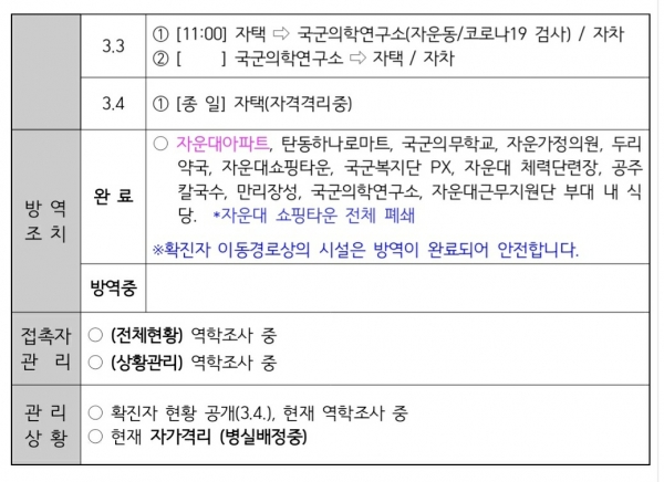 이후 25일엔 추목동 소재 음식점 만리장성에서, 29일엔 자운가정의원과 두리약국을 방문한 뒤 이달 2일에도 추목동 소재 자운대 근무지원단 부대 내 식당과 PX 등에서 활보한 것으로 나타났다.