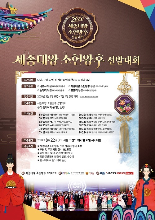 이미 참가신청을 한 참가자는 홈페이지에서 변동된 일정을 확인하여 참가지역을 변동 할 수 있으며 신규 신청 참가자도 홈페이지 및 모바일에서 참가신청이 가능하다. 자세한 대회 일정은 세종대왕 소헌왕후 선발대회 공식 홈페이지에서 확인 가능하다.