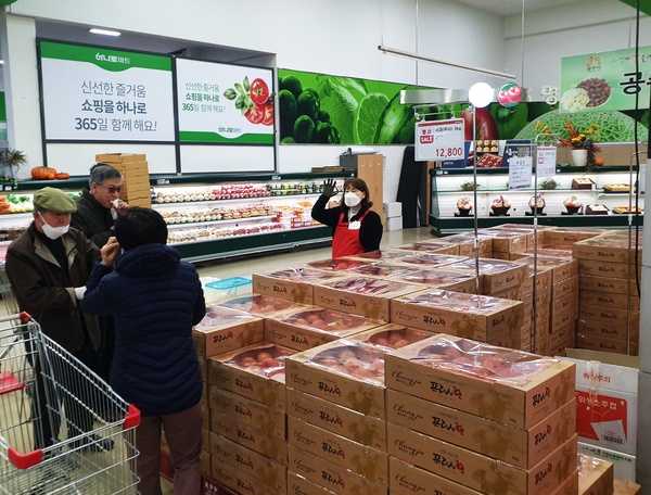 시는 지역경기 침체로 어려움을 겪고 있는 지역 농가를 돕고 충주사과 홍보 극대화를 위해 지난 5일부터 18일까지 전국 농협 하나로마트 중대형매장에서 특별 판촉행사를 열고 있다.