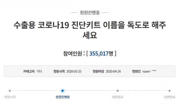 한편 ‘수출용 코로나19 진단키트 이름을 독도로 해주세요’의 국민 청원은 4일 오후 4시 기준 35만 5017명을 기록했다.