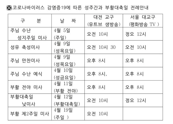 천주교 대전교구 관계자는 “성주간과 부활대축일을 교우들과 함께 할 수 없기에 느끼는 신부님들의 안타까움이 매우 크리라 생각한다”면서도 “지금 우리 교회의 적극적인 협조와 노력이 사람을 사랑하고 살리기 위한 실천”이라고 당부했다.