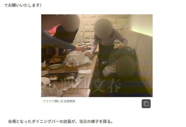 주간문춘이 입수한 수련의들의 사진에는 여성이 손에 들고 있던 타르트를 남성에게 먹이거나 심지어 남성들끼리 입맞춤을 하고, 제3자가 손으로 머리를 눌러 입맞춤을 하게 만드는 모습이 그대로 담겨 있다.