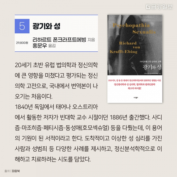 1840년 독일에서 태어나 오스트리아에서 활동한 저자가 빈대학 교수 시절이던 1886년 출간했다. 사디즘·마조히즘·페티시즘·동성애(호모섹슈얼) 등을 다뤘는데, 이 용어의 기원이 된 서적이라고 한다.