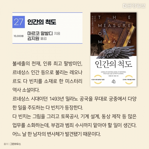 다 빈치가 노트에 쓴 자신에게 보내는 편지를 소설을 풀어가는 도구로 사용한 것도 흥미롭다. 위대한 천재의 생애를 소재로 했지만 때로는 평범하고 유쾌한 캐릭터로 묘사하는 부분도 신선하다.