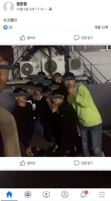지난 10일 한 온라인 커뮤니티에는 ‘정준원 본체 페북’이라는 제목으로 그와 관련된 다수의 사진이 게시됐다. 사진 속 정준원은 친구들과 함께 소주와 맥주가 놓여져 있는 테이블에 있거나, 흡연을 하는 모습이 포착되었다. 다른 사진에선 전자담배를 찍어 올린 뒤 ‘살 사람’이라는 문구를 남기기도 했다. 현재 해당 사진들은 삭제된 상태다. 정준원은 2004년생(16세)으로 술, 담배를 살 수 없다.