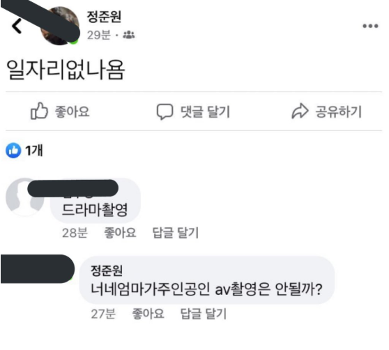 이에 누리꾼들은 “드라마촬영이란 댓글이 욕도 아닌데 왜 쟤는 패드립갈기냐 이말이지”, “선 넘었네”, “부부의 세계에서 해강이 걔임?” 이라는 반응을 보였다.
