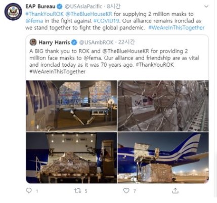 미 국무부 동아태국은 이날 트위터에 "코로나19와 싸움 속에서 미 연방재난관리청(FEMA)에 마스크 200만 장을 제공해줘 한국에 감사하다"고 밝혔다.