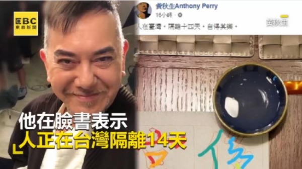 자유시보와 빈과일보 등에 따르면 영화 '첩혈속집', '무간도'에 출연했던 홍콩의 대표 배우 앤서니 웡은 지난 11일 밤 자신의 페이스북에 현재 대만에 있으며 14일간의 자가 격리 중이라고 밝혔다.