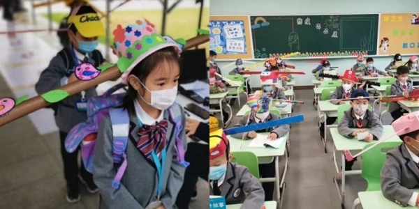 지난 달 27일 중국 광밍(光明) 등 현지 언론에 따르면 항저우에 위치한 양정초등학교는 1학년 학생들이 직접 만든 '1m 모자'를 쓰고 등교했다. 학교 측은 안전하고, 위생적이고 환경친화적인 재료를 이용해 어린이와 함께 모자를 만들어 오도록 미리 요청했다. 해당 학교는 현재 1학년만 있다.
