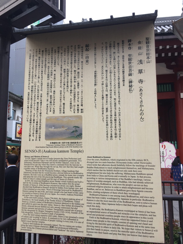 센소지의 위상은, 도쿄에 가서 아사쿠사의 센소지를 보지 않으면 서울에 가서 인사동을 보지 않고 간 것과 다를 바 없다고 할 만큼 유명하다. 다만, 1923년 9월 관동대지진과 2차 대전 때 사찰 대부분이 소실되어서 현재의 건물은 1960년 이후 콘크리트로 지어서 사찰의 유명세에 비하면 문화재적인 가치는 그다지 높지 않다. 다만, 도심 속에서 쉽게 찾아갈 수 있는 사찰이라는 점에서 서울 시내의 조계사나 봉은사와 비슷하다고 할 수 있다.