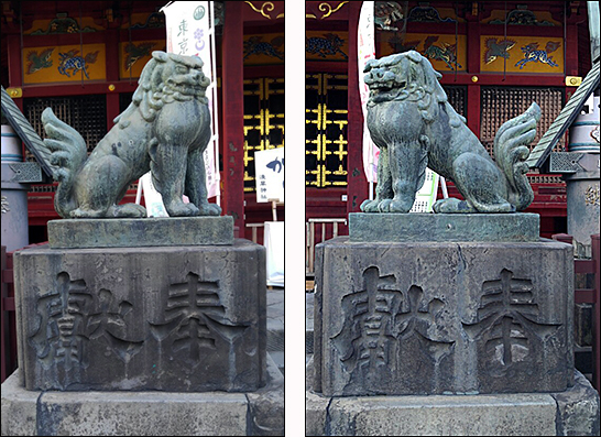 신사와 사찰 건물이 함께 공존하는 센소지에서는 본당의 관음상을 ‘센소 관음’이라 하지 않고, 특별히 '아사쿠사 간논(浅草観音)'이라는 음독으로 불리고 있다. 본당 왼편에 약사당이 따로 있고, 오른편에는 아사쿠사 신사가 있다. 신사 양편에는 커다란 고마이누(高麗犬) 석상이 있는데, 입을 크게 벌린 것이 수컷이고, 입을 다문 녀석이 암컷이라고 한다. 일본에서는 고구려를 ’고려(高麗)‘라고 쓰고 ‘고마’라고 발음하고, 개를 이누(いぬ)라고 하니, 결국 신사 앞의 수호신 ‘고마이누’는 ‘한반도의 개’임을 말하는 것이지만, 요즘 일본인들은 ‘고마이누'를 고마이누(狛犬)’라고 쓰고 있다. 이것은 의식적으로 고려라는 한자(高麗)를 회피하기 위한 의도로 보인다.