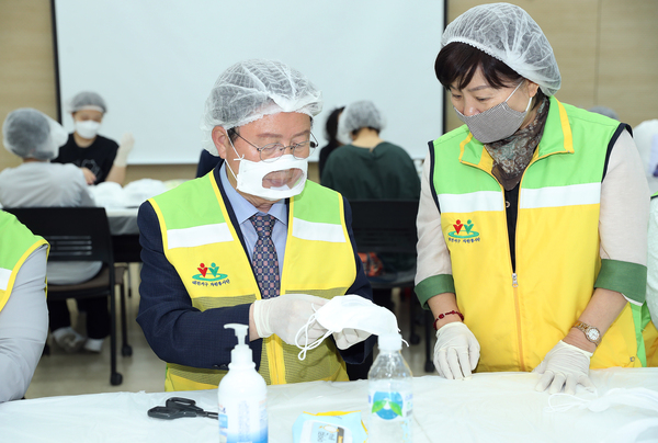 [금강일보 신성룡 기자] 장종태 서구청장이 1일 청각장애인생애지원센터를 방문해 직접 투명 마스크 제작 봉사활동을 펼치고 관련자를 격려했다. 센터에서 제작 중인 투명 마스크는 청각장애 학생 지도 교사용으로 서구자원봉사협의회원과 기업체 봉사자 40여 명으로 구성된 봉사자가 매일 400여 개를 제작해 각 시·도 특수교육지원센터로 발송되고 있다. 후원업체는 위택 코퍼레이션㈜, ㈜아시안스타, 포낙보청기 세종센터이며 대전시자원봉사센터, 서구자원봉사센터, 서구자원봉사협의회 등이 협력한다.