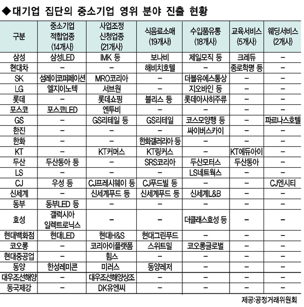 그런데 대기업 계열 14개 사가 중소기업 적합업종 5개 품목(LED램프, 김, 면류, 골판지상자, 레미콘), 21개 사가 사업조정 신청 7개 업종(MRO, 식자재유통, SSM, 철근가공, 아울렛, 대형마트, 상조업)에 이미 진출해 있고, 19개 사가 식·음료소매업, 18개 사가 수입품유통업, 5개 사가 교육서비스업, 2개 사가 웨딩서비스업에 뛰어든 것으로 조사됐다.