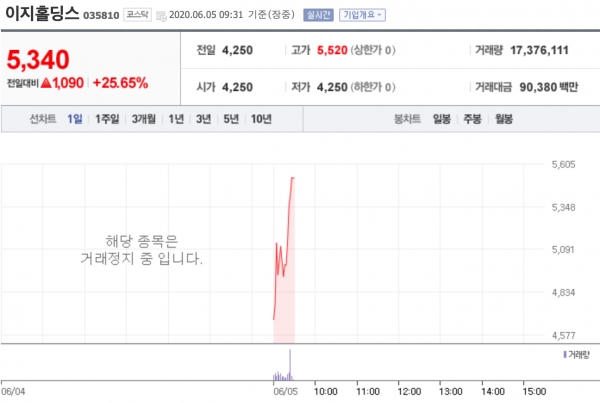 이지홀딩스가 상한가를 기록했다. 이지홀딩스는 5일 오전 09:29분 기준 전일대비 +27.06%(1150원) 상승한 5400원에 거래되고 있다.