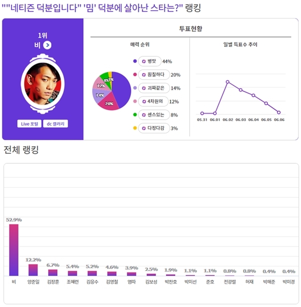 커뮤니티 포털사이트 디시인사이드(대표 김유식)와 취향 검색 기업 마이셀럽스가 운영 중인 '익사이팅디시'가 '"네티즌 덕분입니다" '밈' 덕분에 살아난 스타는?'으로 투표를 실시한 결과 비가 1위에 올랐다. 이 투표는 지난 5월 31일부터 6월 6일까지 총 7일간 진행했다.