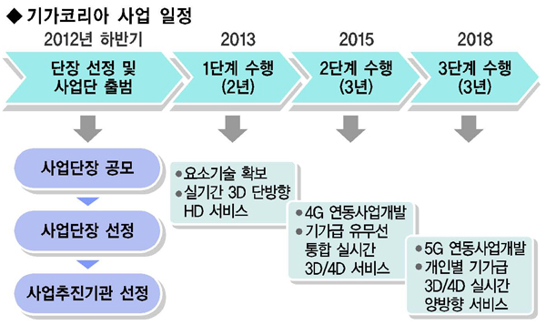 Giga KOREA 프로젝트는 기가급 속도의 무선 환경에 필요한 장비와 부품, 서비스 등 모바일 생태계 전반을 업그레이드하는 대장정이다. 네트워크와 콘텐츠, 스마트폰·홀로그램과 같은 단말, 차세대 슈퍼컴퓨팅 등 플랫폼·소프트웨어를 고도화해 스마트혁명의 부산물인 빅 데이터(big data)가 막힘없이 흐를 수 있는 초고속연결망을 구축하는 사업으로 우리나라 정보통신기술 싱크탱크인 한국전자통신연구원(ETRI)은 이 같은 기반 조성에만 2020년까지 1조 5000억 원이 필요할 것으로 예측했다.