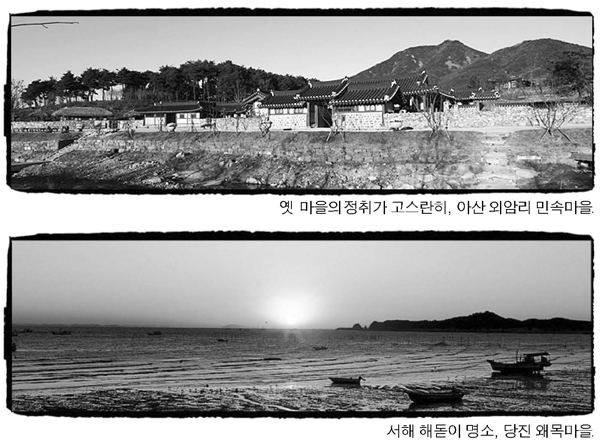 옛 마을의 구성진 정취가 물씬 풍기는 아산시 송악면 외암리 민속마을. 지금도 옛 모습을 간직한 집들의 이끼 낀 돌담을 돌면 이 마을의 역사를 짐작할 수 있는데, 돌담너머로 집집마다 뜰 안에 심어 놓은 과일나무 및 마을 입구의 장승을 비롯해 조선시대의 생활상을 엿볼 수 있는 디딜방아, 연자방아, 물레방아, 초가지붕 등이 보존돼 있다.