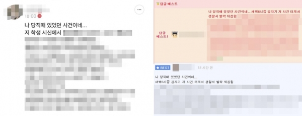 온라인 커뮤니티에서는 지난 11일부터 '나 당직 때 있었던 사건이네…'로 시작되는 댓글이 빠르게 퍼져나갔다. A 경찰관이 작성한 이 글에는 사건 당사자가 1999년 군 복무 중 탈영해서 여자친구를 죽이고 17년을 복역했다는 내용, 아들 시신의 두개골이 망치로 함몰된 상태였다는 내용 등이 담겼다.