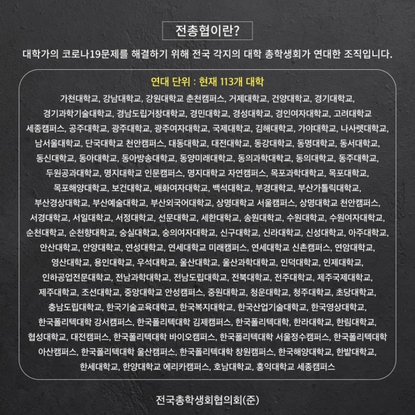 대학가의 코로나19문제를 해결하기 위해 전국 각지의 대학 총학생회가 연대한 조직이 있다 바로 전국총학생회협의회이다.