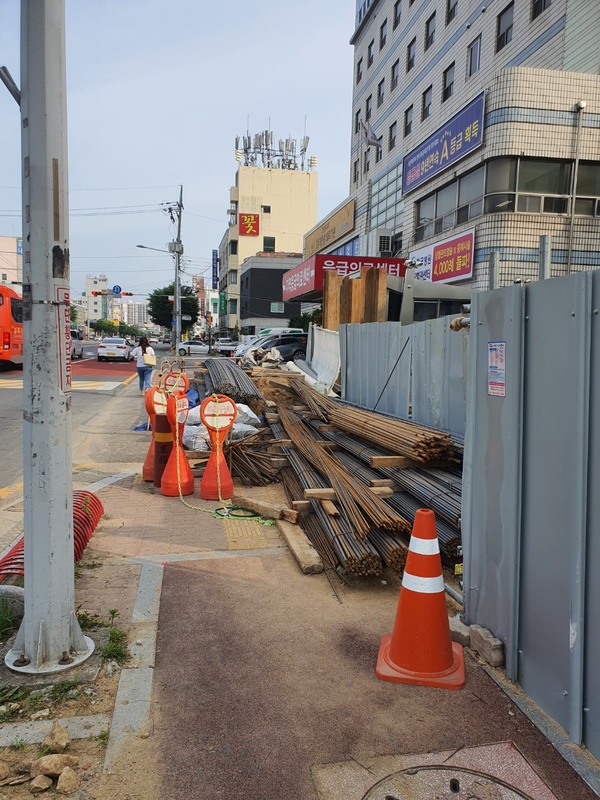 현장 바로 옆 인도에는 철근을 비롯한 각종 건축자재와 골재 더미가 쌓여 있어 야적장을 방불케 한다. 공사업체가 내다 놓은 건축자재들로 인도는 이미 어린아이 한명이 지나다니기도 힘들 정도로 비좁다.