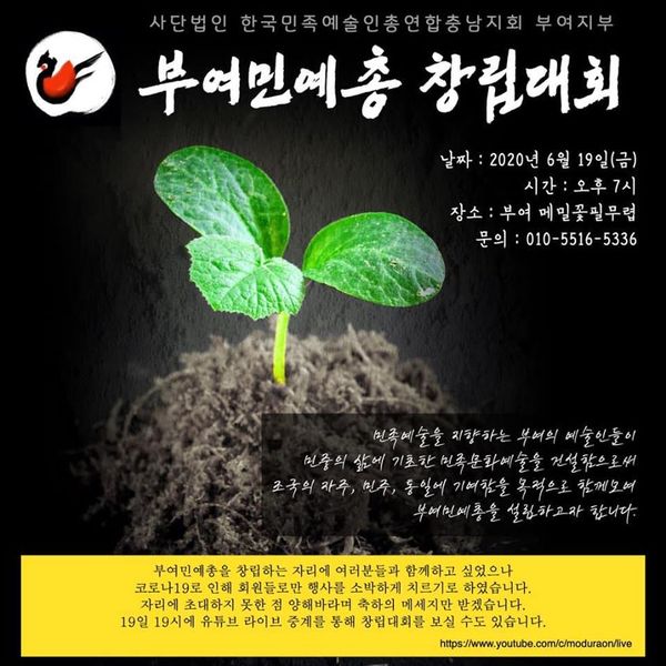 ▲㈔한국민족예술인총연합 충남지회 부여지부(약칭 부여민예총) 창립대회=6월 19일 오후 7시, 부여군 부여읍 쌍북리 메밀꽃필무렵 ☎010-5516-5336 저작권자 © 금강일보 무단전재 및 재배포 금지 금강일보 admin@ggilbo.com 다른기사 보기 SNS 기사보내기 이메일(으)로 기사보내기 다른 공유 찾기 기사스크랩하기 댓글삭제 삭제한 댓글은 다시 복구할 수 없습니다. 그래도 삭제하시겠습니까? 비밀번호 닫기 기사 댓글 0 댓글 접기 댓글입력 권한이 없습니다. 댓글 내용입력 비회원 로그인 이름 비밀번호 댓글 내용입력 댓글쓰기 계정을 선택하시면 로그인·계정인증을 통해 댓글을 남기실 수 있습니다. 회원 로그인 비회원 글쓰기 이름 비밀번호 자동등록방지 로그인 옵션 창닫기 추천기사 [오늘의 금값시세] 11월 26일 금시세(순금·24k)는? 노타 주가, 급등... 호재는? [오늘의 운세] 26일 수요일 나의 운세는?