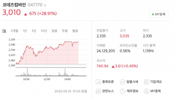 코데즈컴바인이 상한가를 기록했다. 코데즈컴바인은 19일 오후 14:58분 기준 전일대비 +29.55%(695원) 상승한 3030원을 기록했다.