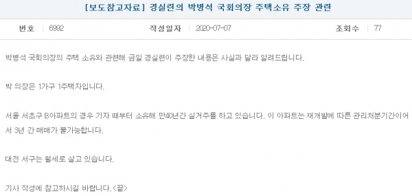 이에 대해 박 의장은 해명 자료를 내고 “강남의 아파트는 40년간 실거주해 온 곳이고, 21대 국회 개원 전에 매매를 하려고 했지만 재개발에 따른 관리처분 기간이어서 3년간 매매가 불가능한 상황”이라고 주장했습니고, 대전 서구에 있는 아파트에 대해선 “자가가 아니라 월세”라고 해명했는데요.