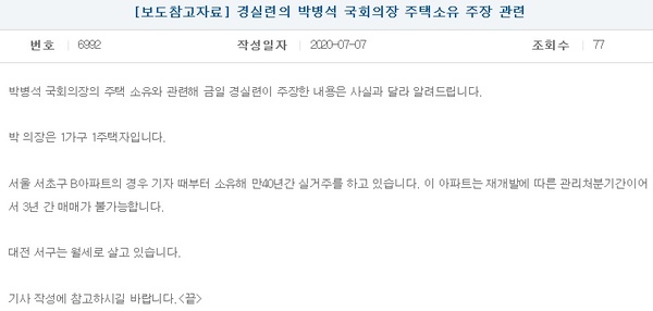 그러자 국회의장실은 즉각 해명 자료를 내고 “경실련이 주장한 내용은 사실과 다르다. 박 의장은 1가구 1주택자”라며 “서울 서초구 아파트의 경우 (중앙일보) 기자 때부터 소유해 만 40년간 실거주를 하고 있다. 이 아파트는 현재 재개발에 따른 관리처분기간 중이어서 3년 간 매매가 불가능하다. 대전 서구에선 월세로 살고 있다”고 밝혔다.