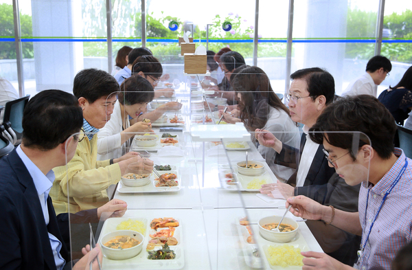 [금강일보 신성룡 기자] 대전 서구는 청사 구내식당에 코로나19 감염예방을 위해 투명가림막을 설치했다고 9일 밝혔다.