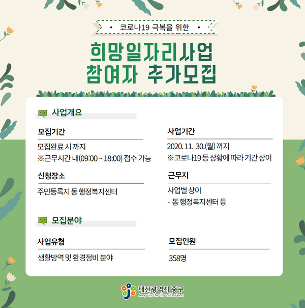 [금강일보 신성룡 기자] 대전 중구는 코로나19 경제위기 극복을 위한 희망일자리사업 중 생활방역 및 환경정비 분야에 358명을 추가 모집한다고 5일 밝혔다.