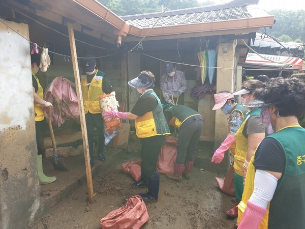 [금강일보 신성룡 기자] 대전 중구자원봉사협의회원들이 5일 사정동 일원에서 집안으로 밀고 들어온 토사처리 및 집안정리 자원봉사를 실시하고 있다. 이날 중구바르게살기운동협의회, 중구자원봉사협의회, 중구통장협의회, 새마을 중구지회, 중구통합방위협의회 5개 자생단체 50여 명이 석교동과 산성동으로 배치돼 피해복구지원을 실시했다. 중구 제공