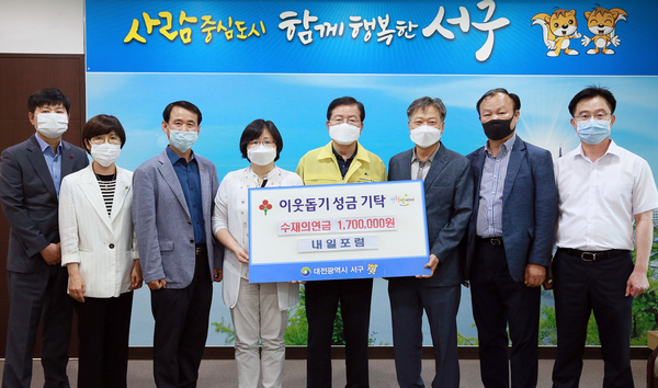 [금강일보 신성룡 기자] 장종태 대전 서구청장(사진 가운데)이 6일 구청 갑천누리실에서 김진원 내일포럼 회장(오른쪽 세 번째)로부터 수재의연금 170만 원을 기탁받고 있다. 기탁금은 지난달 30일 폭우로 수해를 입은 주민을 위해 쓰여질 예정이다. 서구 제공