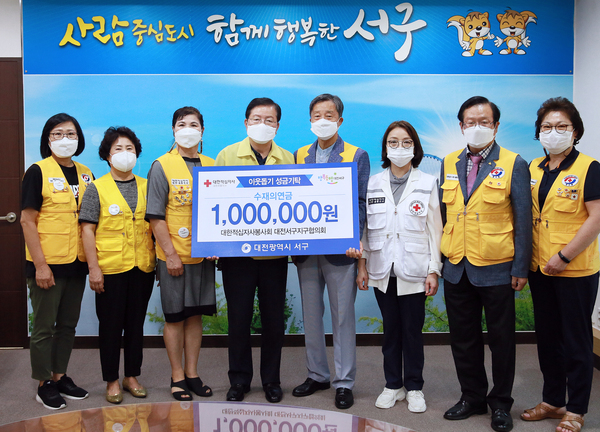 [금강일보 신성룡 기자] 장종태 대전 서구청장(오른쪽 네 번째)이 6일 갑천누리실에서 조산구 대한적십자봉사회 서구지구협의회장(오른쪽 다섯 번째)으로부터 침수 피해 주민을 위해 써달라며 100만 원을 기탁받고 있다. 기탁금은 코스모스아파트를 비롯한 지역 수해민에게 전달된다. 서구 제공