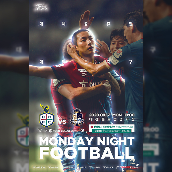 [금강일보 강정의 기자] 대전하나시티즌은 17일 오후 7시 대전월드컵경기장에서 열리는 ‘하나원큐 K리그2 2020’ 15라운드 서울이랜드전 티켓 예매를 시작했다.