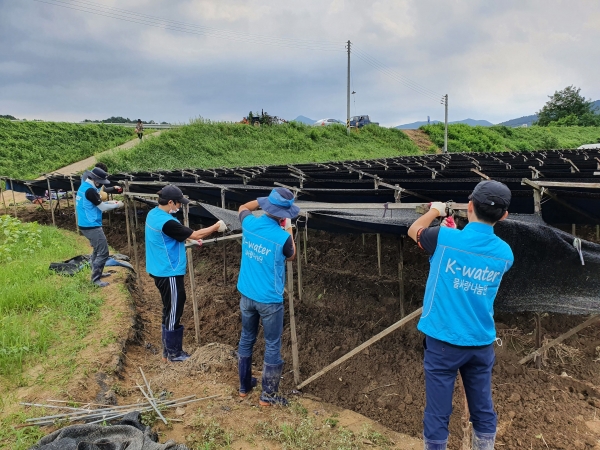 K-water의 임직원 자원봉사단체인 ‘물사랑나눔단’ 450여 명은 각지에서 복구작업이 이뤄지던 지난 10일부터 충북 단양군, 충남 금산군, 전남 구례군, 경남 하동군과 합천군 등 집중호우 피해가 심한 지역을 찾아 봉사활동을 이어가고 있다. 피해 지역에 식수용 병물 약 73만 병을 지원하고 이동식 세탁·목욕 지원 차량인 ‘K-water 사랑샘터’ 2대로 단양군과 전남 곡성군 등 3개 지역을 찾아가며 순회지원을 하고 있다.
