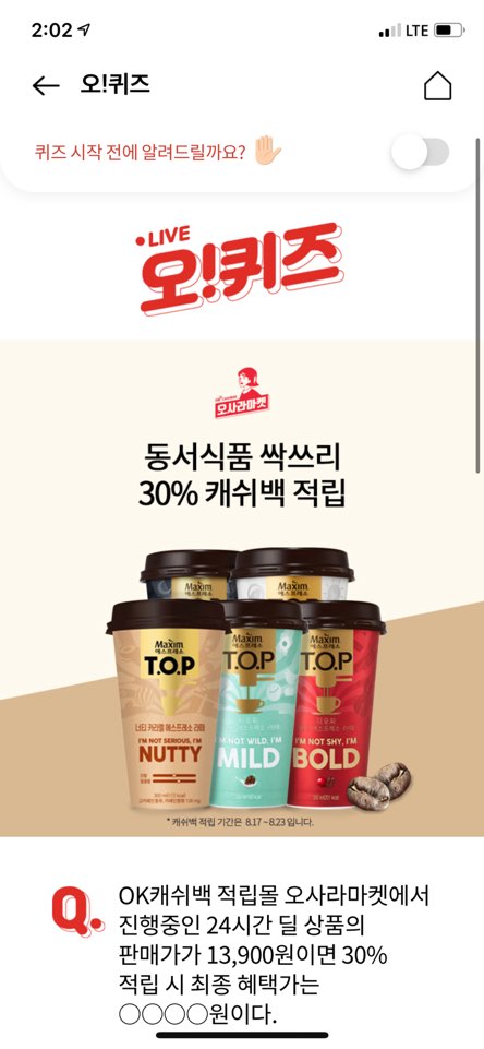 오퀴즈 3시 문제는 "맥심 티오피 에스프레소가 카라멜, 견과류와 만나 특별한 맛을 선사하는 ○○○○○○○이다."이다.