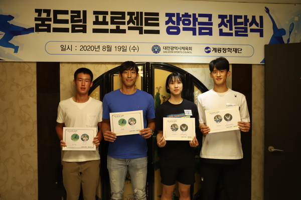 대전시체육회는 지난 6월 권혁(탁구·동문초6), 최나현(탁구·서대전초6), 서탄야(태권도·대전체육고3), 송우담(테니스·만년고2) 등 4명을 꿈드림 프로젝트 글로벌 체육인재로 선정해 장학금을 전달했다.