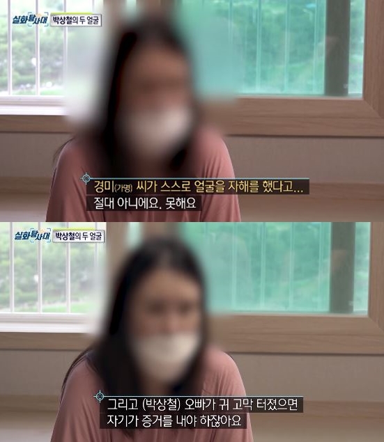 B씨는 박상철의 자해 주장에 “절대 아니에요. 못해요”라며 반박했다. “박상철은 유도 유단자며 싸움을 굉장히 잘한다. 만약 귀 고막이 터졌으면 자기가 증거를 내야 하는데 가족이라서 진단서를 안 끊었다며 말도 안 되는 주장을 하고 있다. 저는 박상철 씨가 다 거짓말 한다고(생각한다).. 본인이 더 잘 알거에요”라며 서로 엇갈린 주장을 보였다.