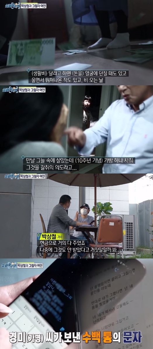 박상철은 B씨의 주장에 “돈을 현금으로 다 줬다”며 나중에 그것도 안 받았다고 거짓말 할까봐 게좌로 300만원씩 꼬박꼬박 보냈다“며 “돈을 갚아주면 금방 ‘사랑해요’ 모든 다 바칠 듯이 떠들어 놓고 명품 안 사왔으면 욕설을 하고 메시지로 협박했다”며 당시 받은 수백 통의 협박 메시지를 공개했다.