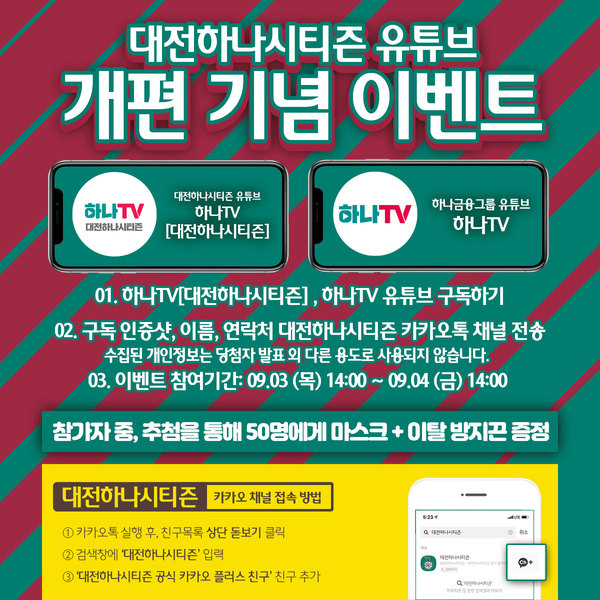 이벤트 참가 방법은 하나시티즌 공식 유튜브 채널인 ‘하나TV [대전하나시티즌]’와 하나금융그룹 유튜브 채널인 ‘하나TV’ 구독 인증샷을 하나시티즌 공식 카카오톡 채널을 통해 이름, 연락처와 함께 발송하면 된다.
