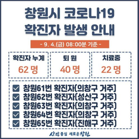 창원61번 확진자는 의창구에 거주하고 있으며 타지역 확진자 접촉했다. 창원62번 확진자(성산구 거주), 창원63번 확진자(의창구 거주), 창원64번 확진자(의창구 거주)도 모두 타지역 확진자와 접촉했다.