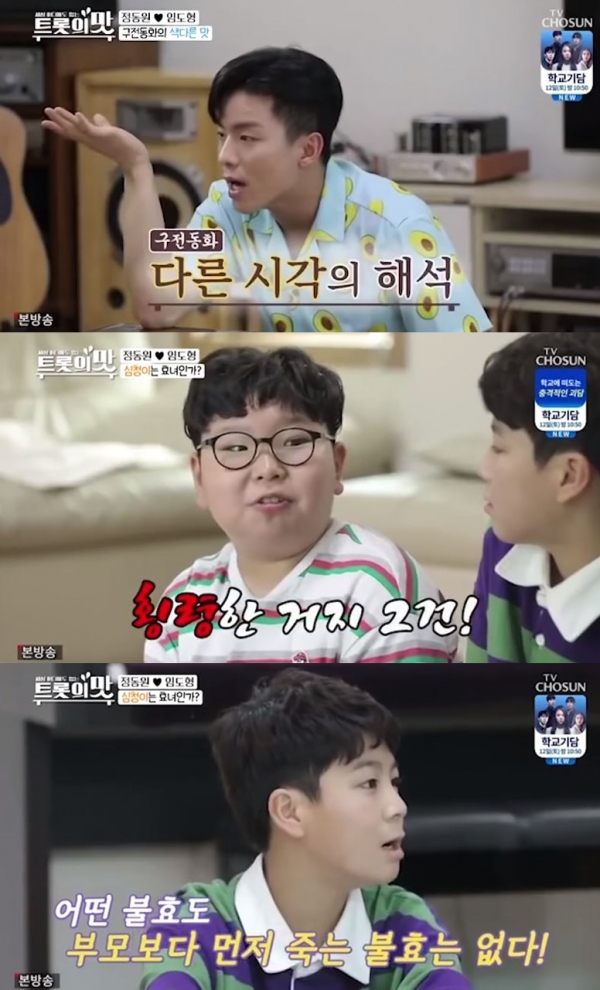 임도형은 “맹인 잔치를 연게 용궁 돈인데 그건 횡령한 것이다”라며 새로운 관점으로 접근했다. 정동원은 “세상에 어떤 불효도 부모보다 자식이 먼저 죽는 것 다는 없을 것”이라며 심청이는 효녀가 아니라고 주장했다. 또한 “다시 부활을 하면 아버지가 심장마비에 걸릴 수 있다”고 말했다.