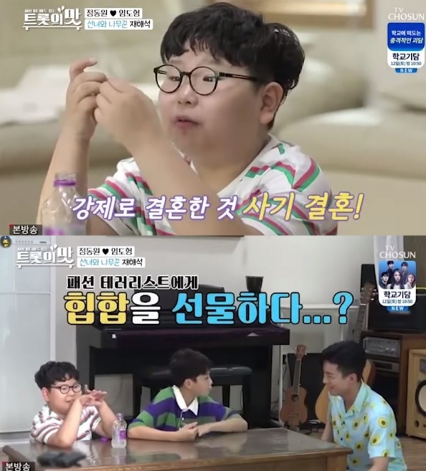 정동원은 반대로 “선녀가 잘못했다”는 주장을 펼쳤다. “나무꾼이 보기에는 그 옷이 거슬렸던 거죠. 아이 그게 스타일이냐”며 패션테러리스트에게 힙합 스타일을 입혀주고 싶었을 것이라며 웃음을 유발했다.