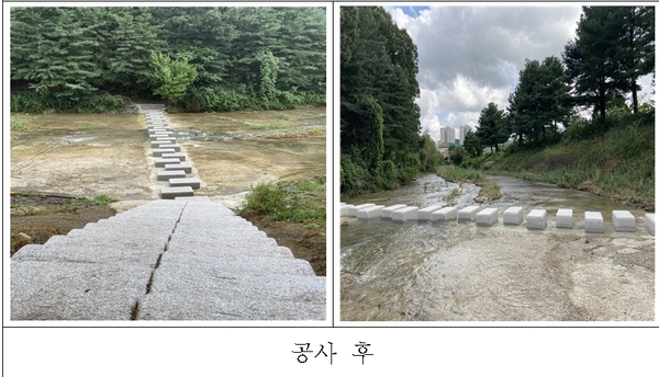 [금강일보 김정섭 기자] 국립대전현충원은 보훈둘레길 이용객들의 안전과 묘역환경 개선을 위해 보훈둘레길 중 보라길 징검다리 돌 교체공사를 실시했다고 9일 밝혔다. 이번 공사는 보훈둘레길로 진입하는 계단 폭을 넓히고 노후 된 길을 건널 때 안정감이 떨어지는 기존 징검다리 돌을 낮고 넓은 돌로 교체, 많은 방문객들이 안전하게 보훈둘레길을 이용하기 위해 추진됐다.