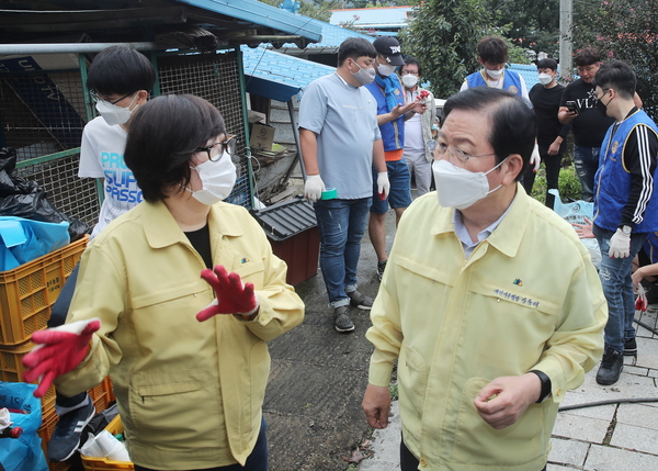 [금강일보 신성룡 기자] 장종태 대전 서구청장이 최근 침수피해로 어려움을 겪는 기성동을 찾아 도배·장판 시공 현장을 점검하고 자원봉사자를 격려하고 있다. 이날 현장에는 구청 직원과 한마음로타리클럽 회원 등 30명이 참여해 도배·장판 시공 사전 준비 및 가재도구를 청소하는 등 힘을 보탰다.