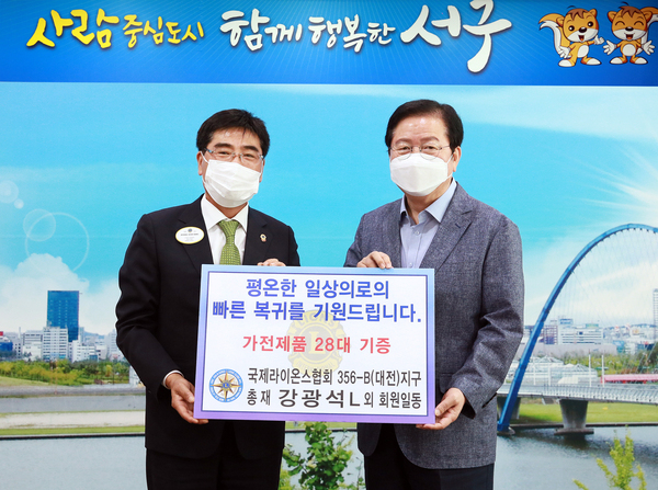 [금강일보 신성룡 기자] 강광석 국제라이온스협회 356-B지구 총재(왼쪽)가 지난 18일 대전 서구청을 방문해 장종태 청장에게 에어프라이기 28대(300만 원 상당)를 기탁하고 있다.