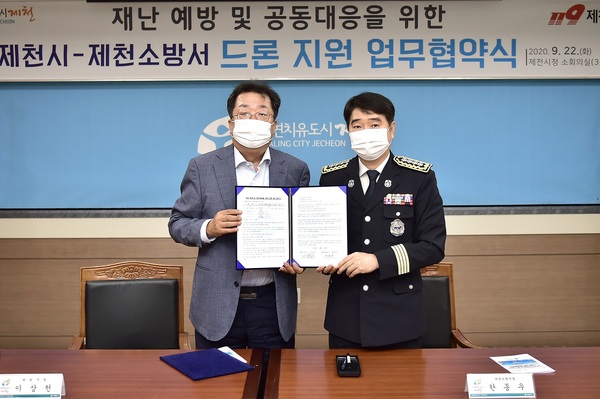 [금강일보 정봉길 기자] 제천시와 제천소방서가 지난 22일 재난예방 및 공동대응을 위한 드론 지원 업무협약을 체결했다.
