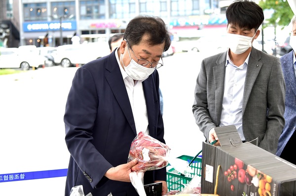이 시장은 이날 제천로컬푸드 직거래장터를 찾아 농산물을 구입하며 장바구니 물가를 몸소 체험하고 행사를 운영 중인 제천로컬푸드협동조합 김현주 조합장과 농가들을 격려했다.