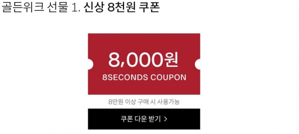 또한 에잇 세컨즈는 골드 위크 선물로 8만원 구매 이상시 사용가능한 신상 8천원 쿠폰을 제공할 뿐 만 아니라 9월 29일부터 10월 5일까지 10만원 이상 구매시 최대 2만원 할인이 가능한 15% 할인 쿠폰도 제공한다.